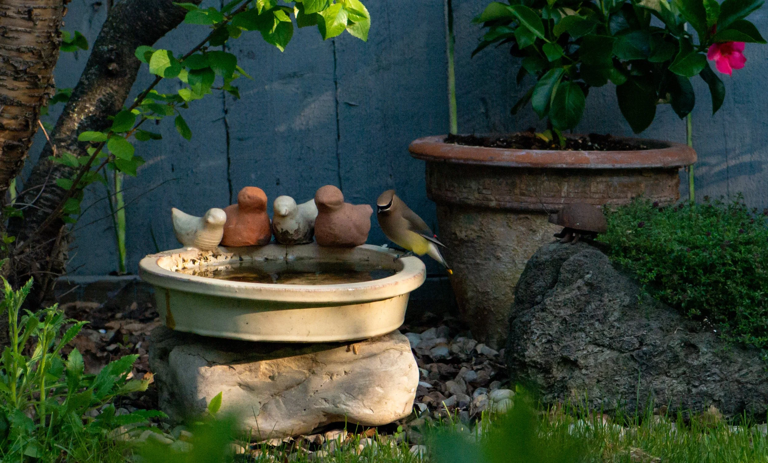 Maybe the message is a bird that arrives. Maybe an angel. In the photograph accompanying this post, you’ll see the waxwing that stopped for a drink in my backyard one evening this week. I was sitting in a chair after taking photos of a whisky glass, my camera on my lap, with my 100mm lens, which is not my default and even that seemed like the luckiest bit of luck. So I didn’t have to move other than to raise the camera and release the shutter, holding my breath.
