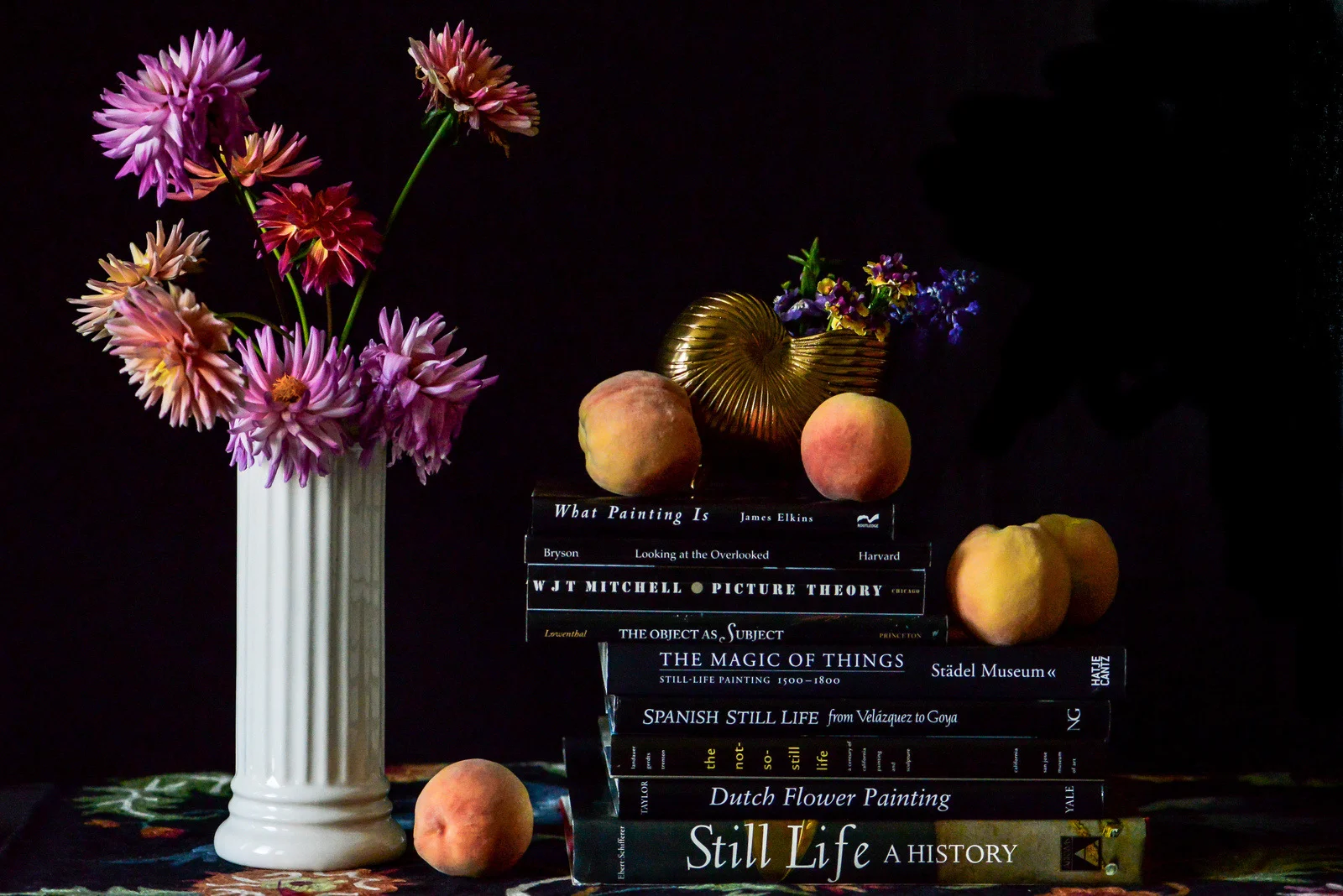 The stable ingredient in most of these experiments is a stack of books about still life. Conveniently, they all have black spines. The first book I read about still life was one of Rob’s titled, Looking at the Overlooked by Norman Bryson. It was published in 1990 and was quite a revelation then, and still holds up now. The books in my still lifes signal to the viewer, perhaps, an accumulation of knowledge, the importance of reading, the prestige of the books. Maybe the viewer finds this pretentious. I’m trying to throw in modern, less conventional items, along with the traditional. In doing so, I’m trying to say something about the way we really live. I’m trying to say something about wealth, abundance, the way things seem vs the way they are. How appearances regarding wealth can be deceiving. I want the objects to speak for themselves, but then, in my writing, I want to dwell on the possibilities. So.