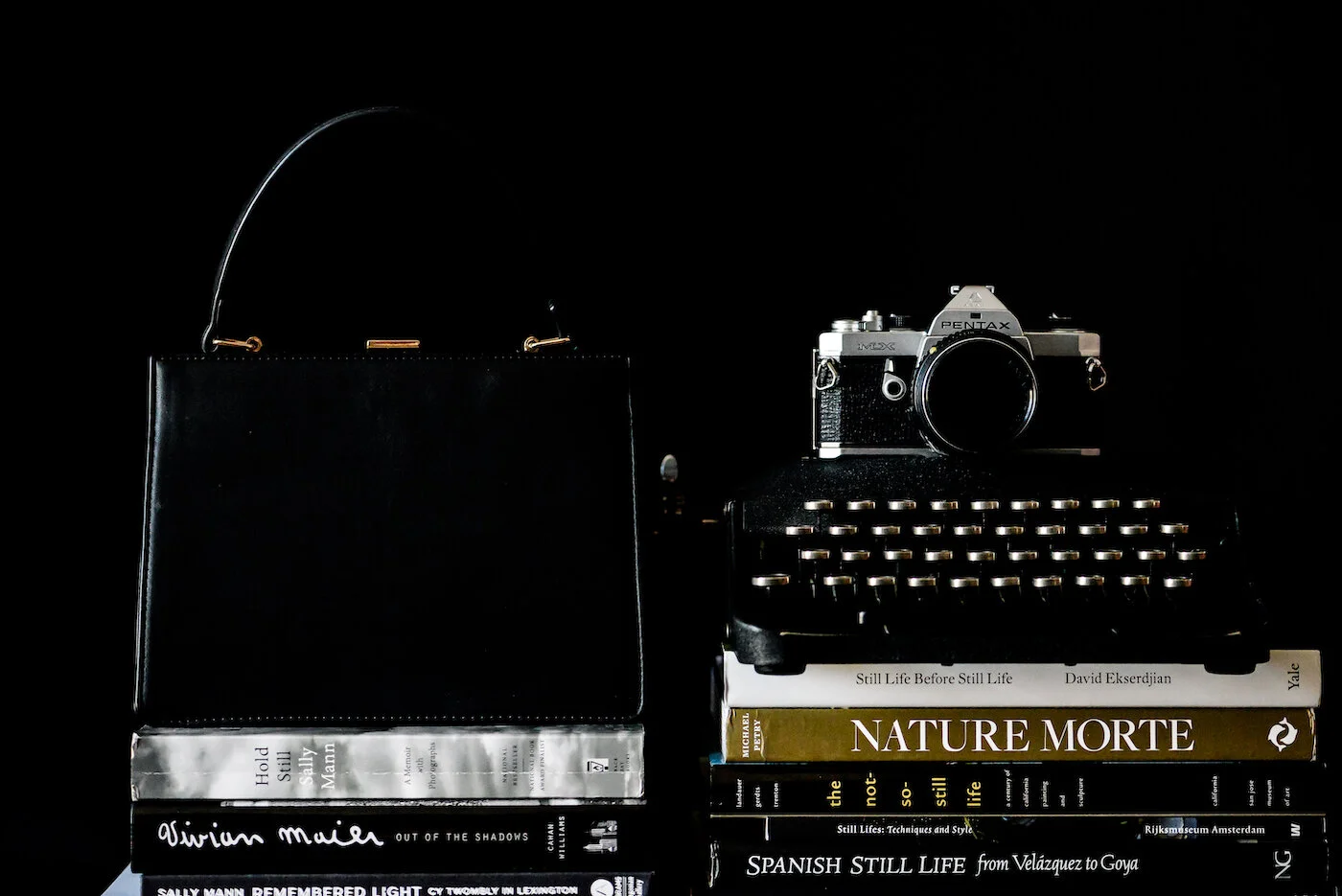 A note on my photos: my first camera — a Pentax MX, the typewriter is a Remington Cadet, and the purse is from Simon’s.